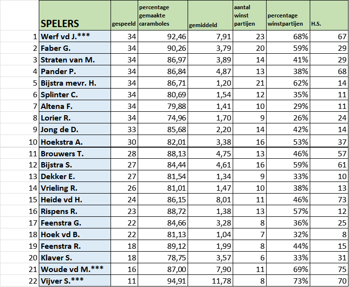 Hoofdcompetitie Stand 23 februari, aangevuld tot 34 wedstrijden vanuit 2e comp.